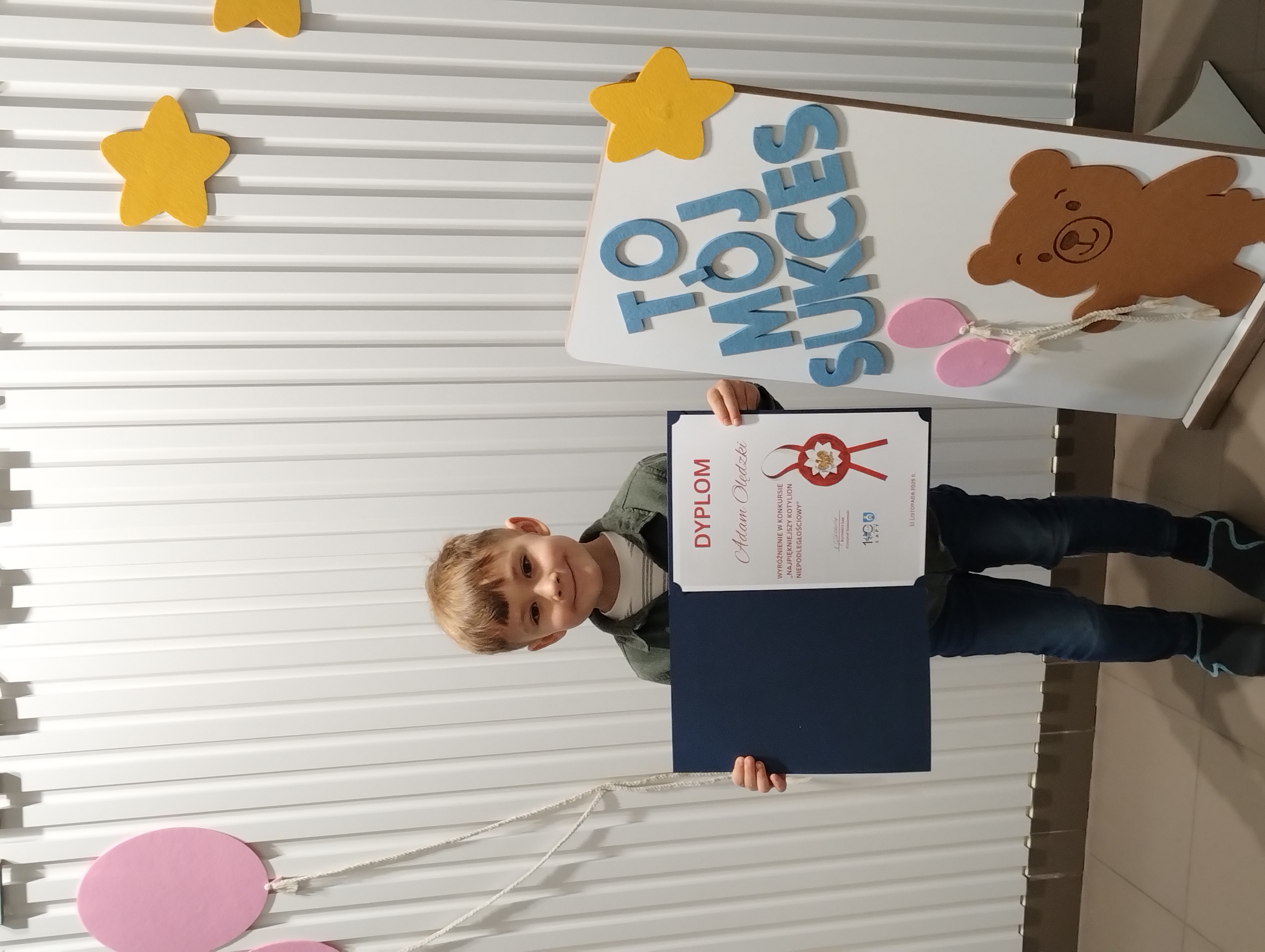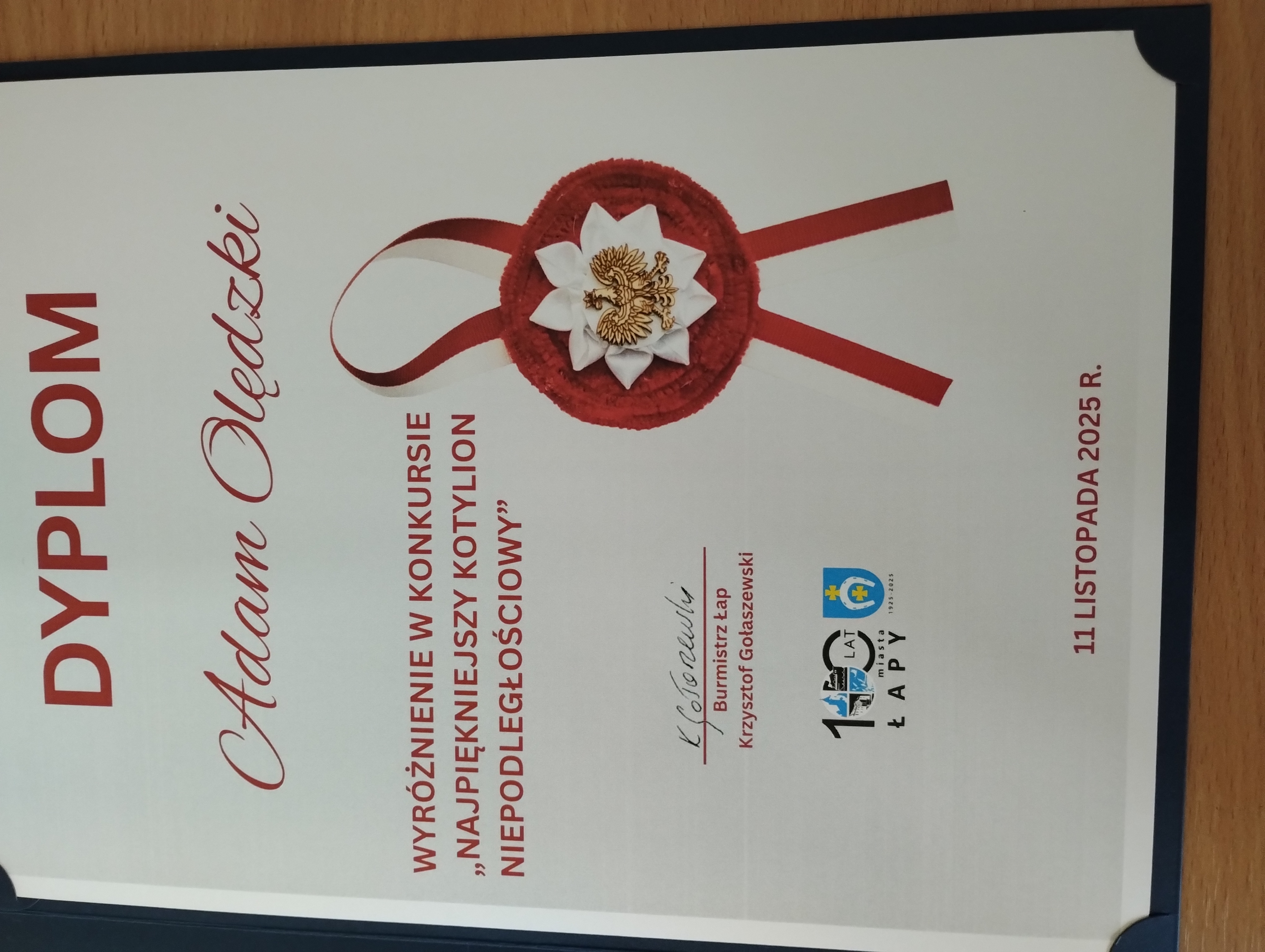 Cieszymy się bardzo, że Adam Olędzki z grupy Żabki, zdobył wyróżnienie w konkursie „Najpiękniejszy kotylion niepodległościowy 2025”. Spośród 48 kotylionów komisja konkursowa powołana przez Burmistrza Łap wybrała trzy najpiękniejsze oraz osiem równie pięknych, które zostały wyróżnione. Wśród tych ośmiu znalazł się kotylion Adasia. Nagrodzeni uczniowie, wraz z rodzicami, zostali zaproszeni na 11 listopada 2025r. po odbiór nagród do Domu Kultury w Łapach. Adaś otrzymał wyróżnienie- w tym grę edukacyjną i 2 karnety do kina w Domu Kultury w Łapach. Gratulujemy!